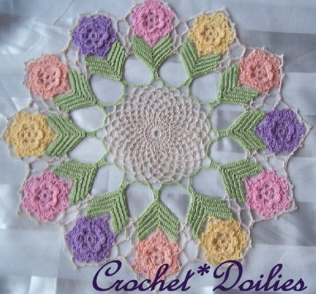 12 beautiful 3D flowers! Lovely pastel colors: peach, pink, maize, lavender, celery and ecru. Whether this Easter or Spring doily is displayed on a light or dark background, it looks absolutely stunning! Made with 100% cotton crochet thread size #10. Approx 15-1/2" diameter. Revised Design! skill level: intermediate to advanced crocheter, crocheting time: approx 12 to 14 hours,