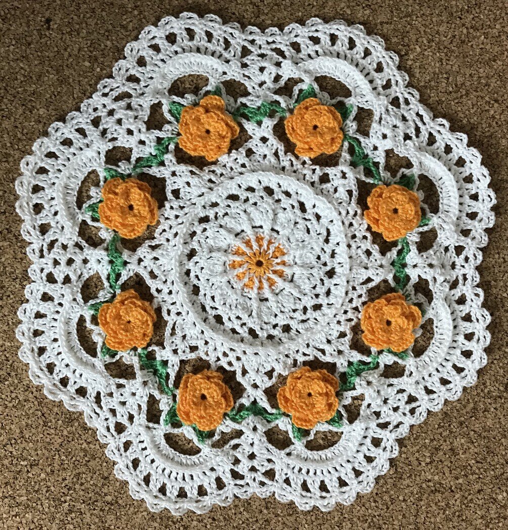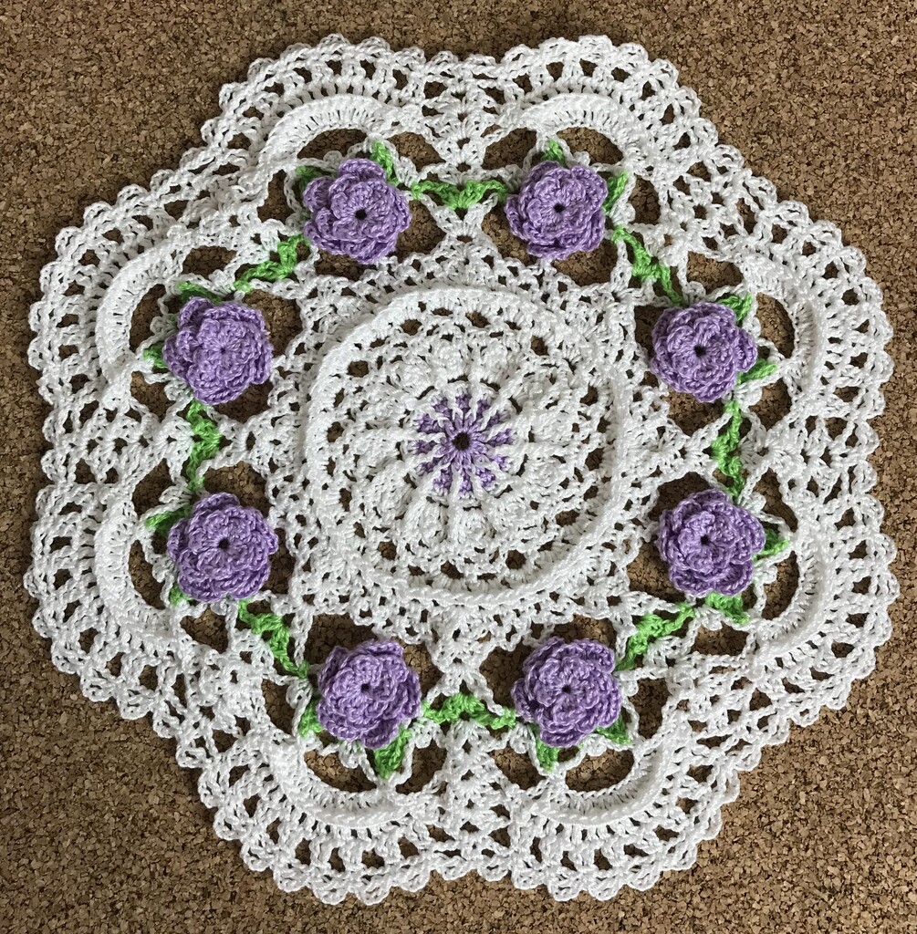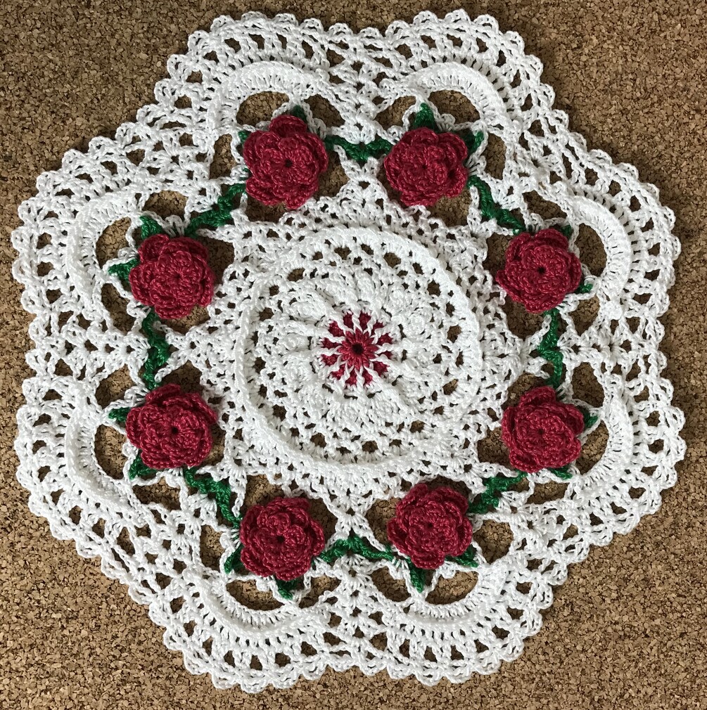 Beautiful crochet doily with 8 roses with leaves. Lots of textured stitches. Measures 9-1/2" diameter. Intermediate to advanced crochet.
